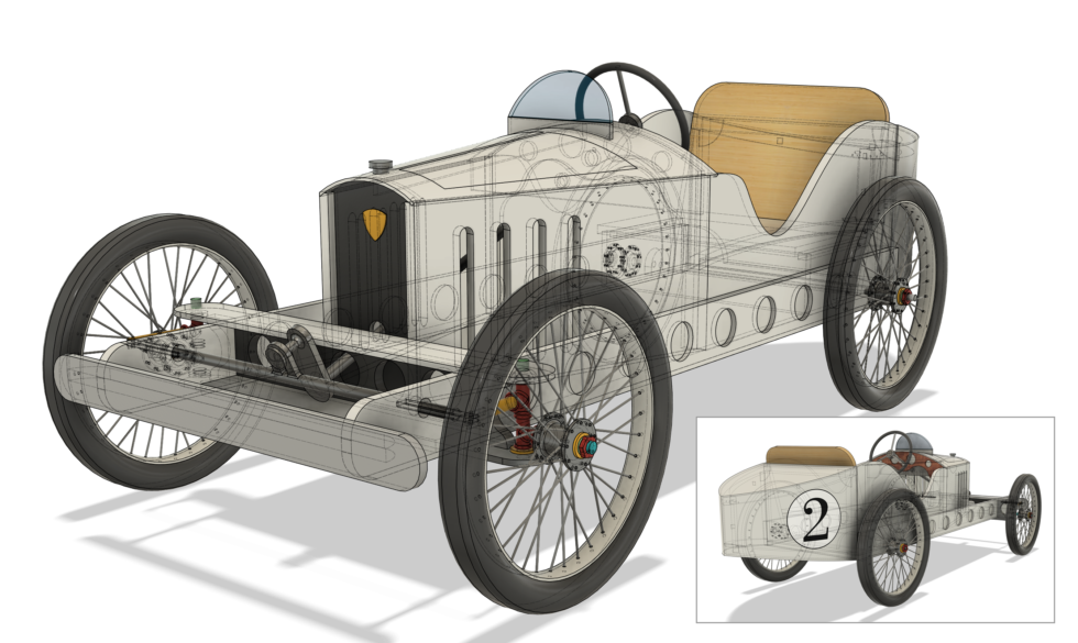 Conception numérique 3D d’une voiture à pédales pour enfant. Le projet est pensé en fonction d’une fabrication facile, à base de matériaux courants trouvables en grandes surfaces de bricolages (planches, mdf, contreplaqué…) et/ou de récupération (roues de VTT).